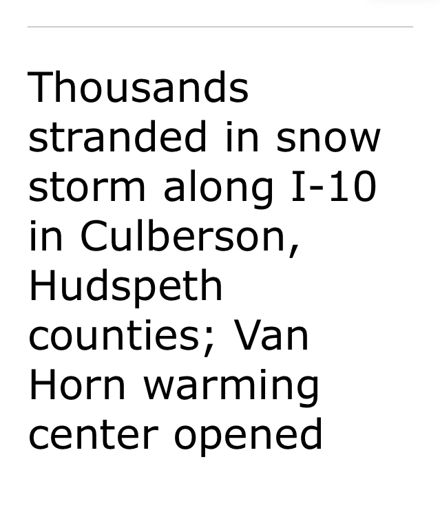 Our trip got a lot more interesting after El Paso, when we came to a dead stop on I-10 for 9 hours. You read that right, 9 HOURS! There was some snow and ice, and a few semi trucks had jack-knifed on the highway, causing both sides of I-10 to close. Unfortunately, that left literally thousands of people stranded in their cars on the highway from about 6:30pm until 3:30am. People were turning off their engines and going to sleep – what else was there to do? Fortunately, our 4-year-old son had a great time. We unbuckled his car seat and he sat up front with me in my lap, then he would climb to the backseat… he had t.v. shows and movies to watch… eventually he fell asleep for the night, nestled in the nook between the back and front seats. (Oh, to be a kid again with the ability to fall asleep anywhere!)