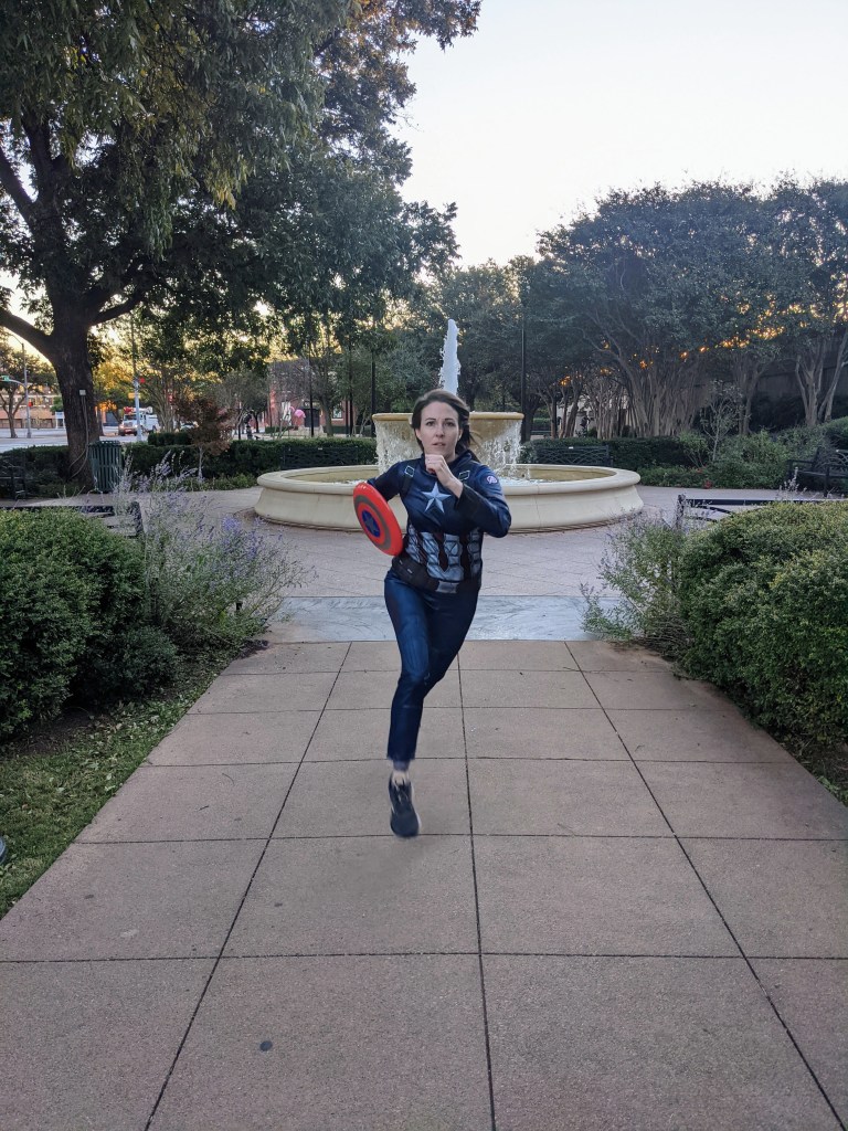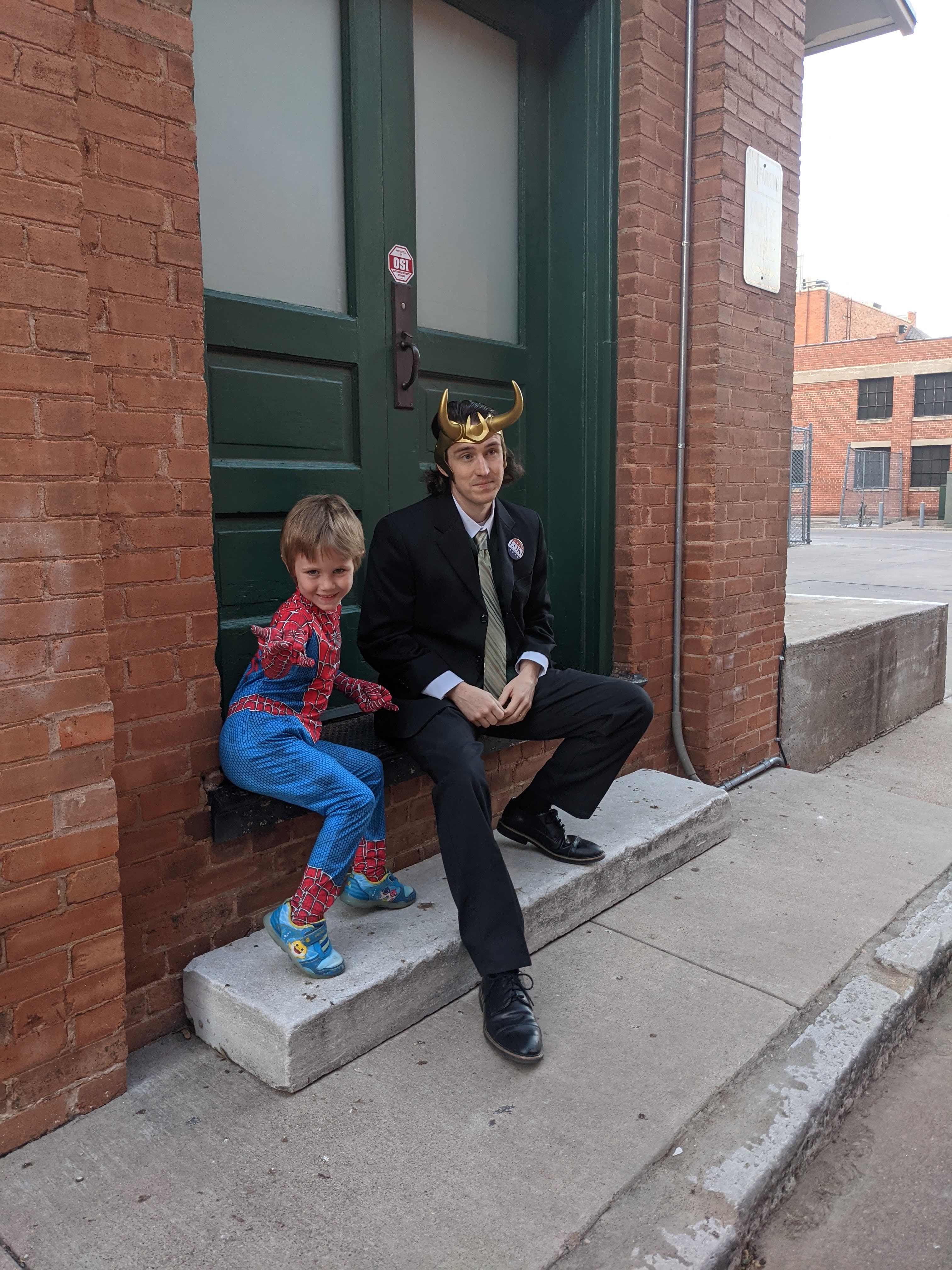 We are not professional cosplayers – I bought the Spiderman and Captain American costume off of Amazon. I spent about $35 for the Spiderman costume and $75 for the Captain America costume. My costume did not come with a shield, so I found a cheap plastic kid’s version for about $20 (it’s only about 12 inches in diameter). Dean used a suit and tie he already had for his Loki variant costume, but ended up buying a green vest and the Loki horns, which together were about $50. I made his “Loki for President” button by finding an image online and then using a 2″ button maker in the ACU Library Maker Lab. (Buttons are 5 for $1).